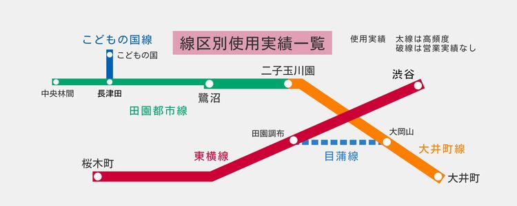 太字は運用された回数の多い線区、破線は回送・試運転等の営業実績のないものです。